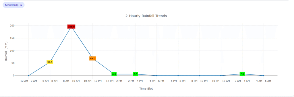 સૌથી વધુ વરસાદ મેંદરડા(જુનાગઢ) તાલુકામાં 338 મિમિ (13.3 ઈંચ) નોંધાયો, નીચે આપેલ ચાર્ટ મેંદરડામાં દર બે કલાકે નોંધાયેલ વરસાદ બતાવે છે.