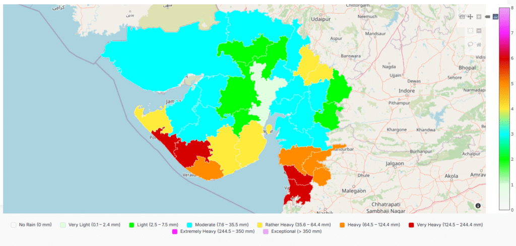 નીચે આપેલ મેપ છેલ્લા 24 કલાકો દરમિયાન રાજ્યના 251 તાલુકાઓ માં વરસાદની વહેંચલી દર્શાવે છે, જે દરેક તાલુકામાં આજે સવારે 6 સુધીમાં છેલ્લા 24 કલાકોમાં નોંધાયેલ વરસાદ, વરસાદની શ્રેણી મુજબના કલરમાં દર્શાવેલ છે. જેમાં સ્પષ્ટ રીતે જોઈ શકાય છે ભારે થી અતિભારે વરસાદ મોટા ભાગે દક્ષિણ ગુજરાત અને સૌરાષ્ટ્રના મહુવા થી દ્વારકા દરિયાઈ પટ્ટીના વિસ્તારોમાં સીમિત જોવા મળેલ છે. જ્યારે અતિશય ભારે વરસાદ જુનાગઢ તેમજ પોરબંદરના 4 તાલુકાઓમાં નોંધાયેલ છે.