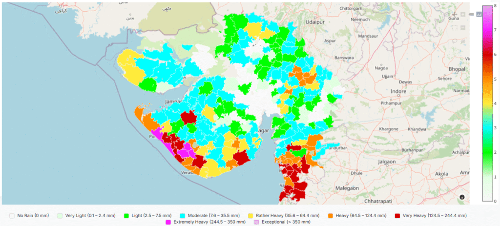 જ્યારે રાજ્યના મધ્ય અને ઉત્તર પૂર્વના વિસ્તારોમાં વરસાદનું જોર ઓછું રહ્યું હતું , તે નીચે આપેલ મેપમાં સ્પષ્ટ રૂપે જોઈ શકાય છે.