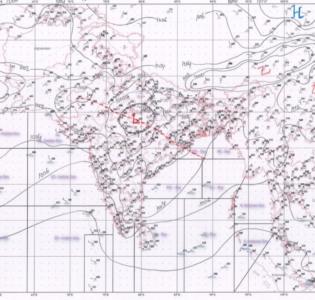 1. મોનસૂન ટ્રફ સામાન્ય સ્થિતિ કરતાં દક્ષિણમાં , જેનો પશ્ચિમ છેડો રાજસ્થાનના પશ્ચિમ/દક્ષિણ પૂર્વ ભાગો (જેસલમેર, કોટા) અને મધ્ય પ્રદેશના મધ્ય ભાગો (નર્મદાપુરમ) માંથી પસાર થાય છે. જે દરિયાઈ લેવલથી 1.5 km ઊંચાઈ સુધી સક્રિય છે.