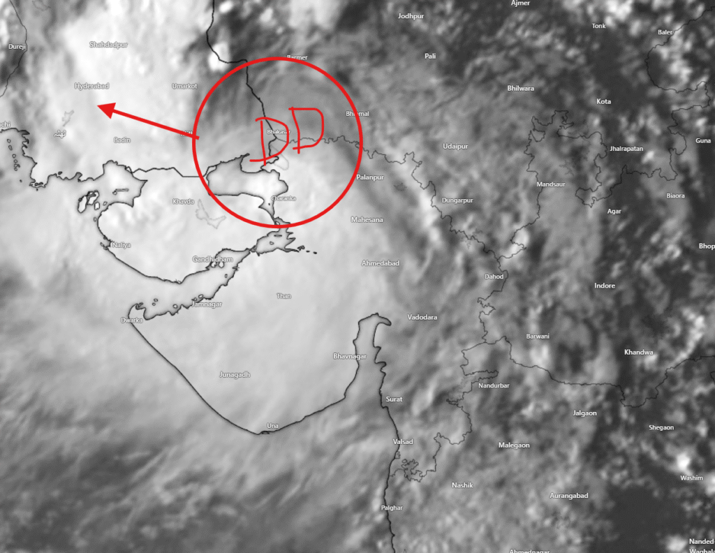 ડીપ ડિપ્રેશન હાલમાં ઉત્તર ગુજરાત/કચ્છ/દક્ષિણ પશ્ચિમ રાજસ્થાન/દક્ષિણ પૂર્વ પાકિસ્તાન બોર્ડર પાસે રહેલું છે. ડીપ ડિપ્રેશનનું સાંજે 5:30 વાગ્યે લોકેશન 24.5 N 71.2 E હતું. જે રાધનપુર થી 80 કિલોમીટર ઉત્તર -ઉત્તરપશ્ચિમમાં, ડીસા થી 110 કિમી પશ્ચિમ-ઉત્તર પશ્ચિમમાં , ભુજ થી 200 કિલોમીટર ઉત્તર પૂર્વમાં હતું. જે આગામી કલાકોમાં પશ્ચિમ-ઉત્તરપશ્ચિમ/ઉત્તરપશ્ચિમ તરફ એટલે કે દક્ષિણ-પૂર્વ પાકિસ્તાનના વિસ્તારો તરફ આગળ વધશે અને ક્રમસહ નબળું પડશે.
